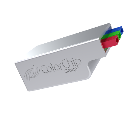 The ColorMux RGB Beam Combiner is built on ColorChip’s wafer-scale Planar Lightwave Circuit (PLC) and SystemOnGlass™ (SOG™) integration technology. It combines RGB laser diodes into a single beam for high brightness and resolution.
