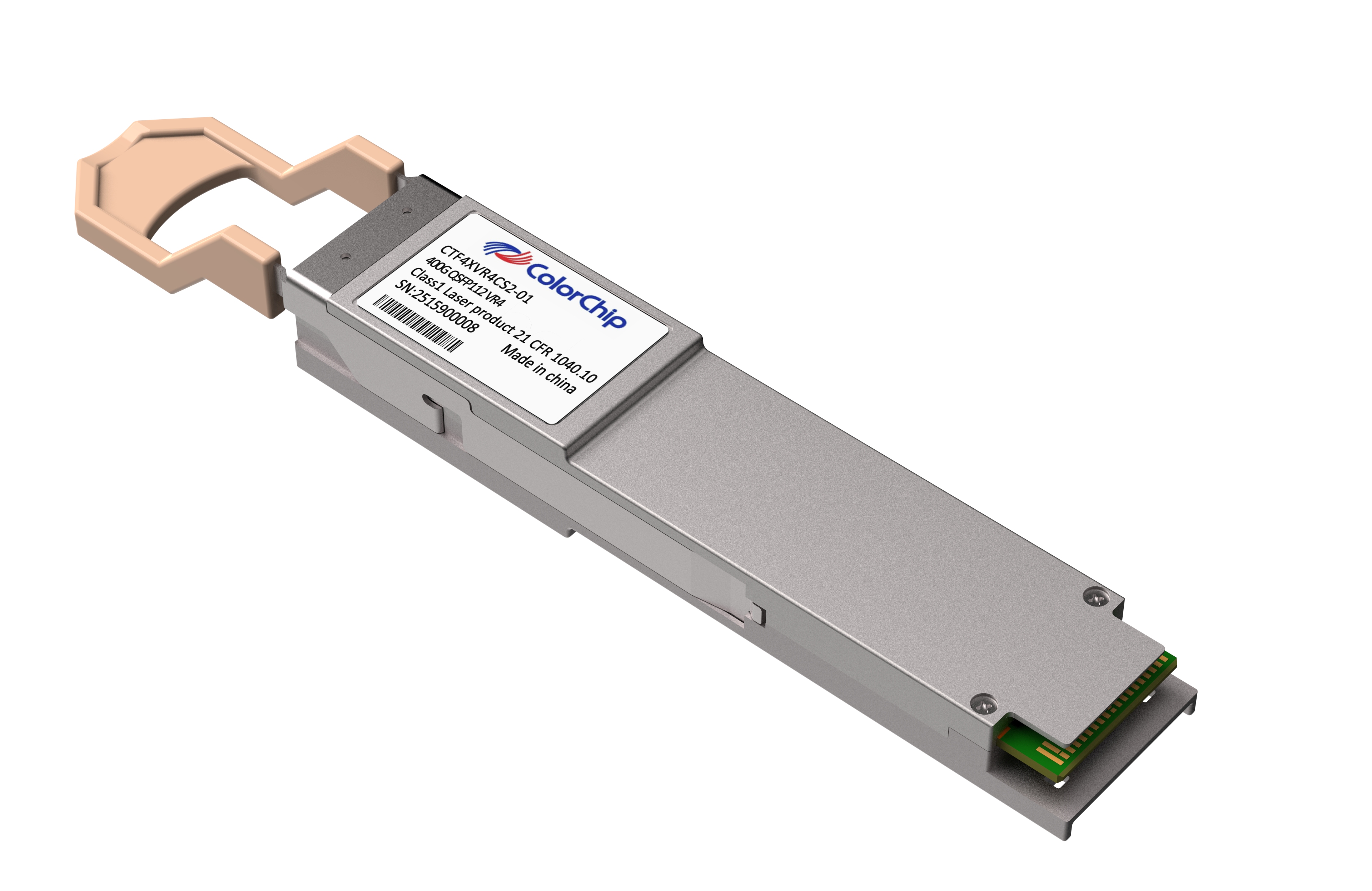 • Colorchip’s 400G QSFP112 VR4 transceiver is designed for use in 400G Ethernet links up to 50m over OM4/OM5 and 30m over OM3 multi-mode fiber. The module converts 4 channels of 100Gb/s (PAM4) electrical input data to 4 channels of parallel optical signals, each capable of 100Gb/s operation for an aggregate data rate of 400Gb/s.